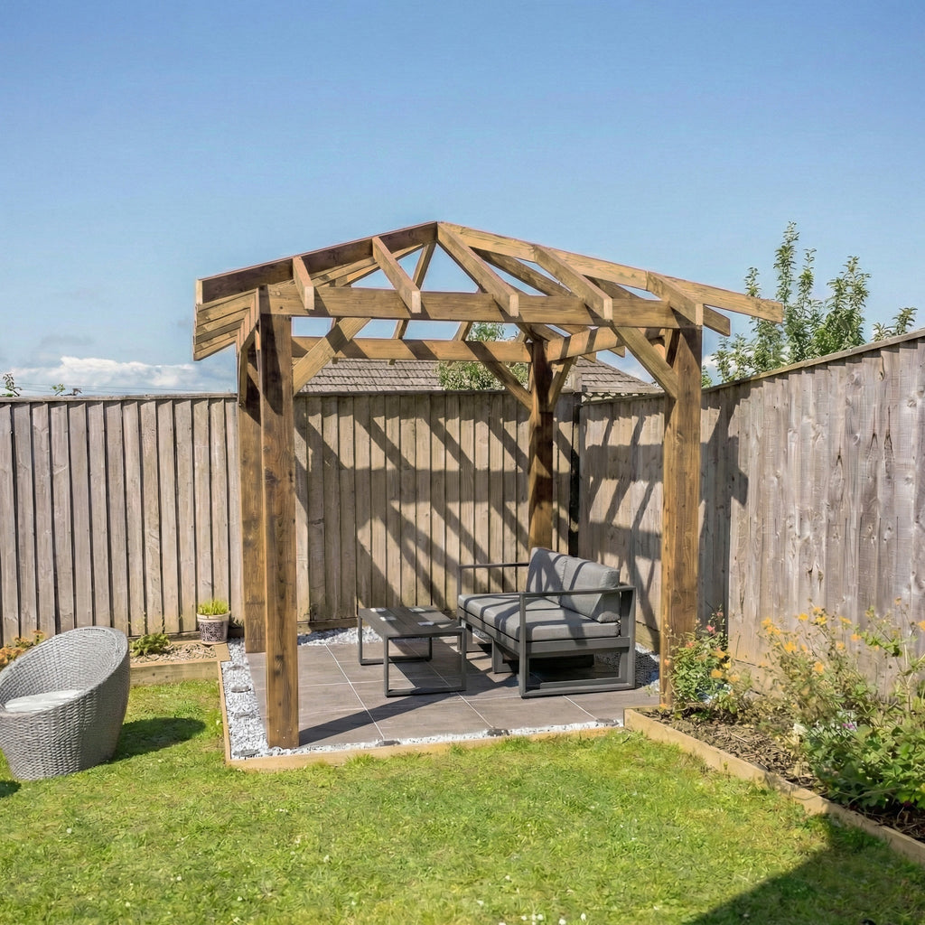 Wooden Pergola with Open Roof design, featuring apex structure and decorative overhang, shown in full view